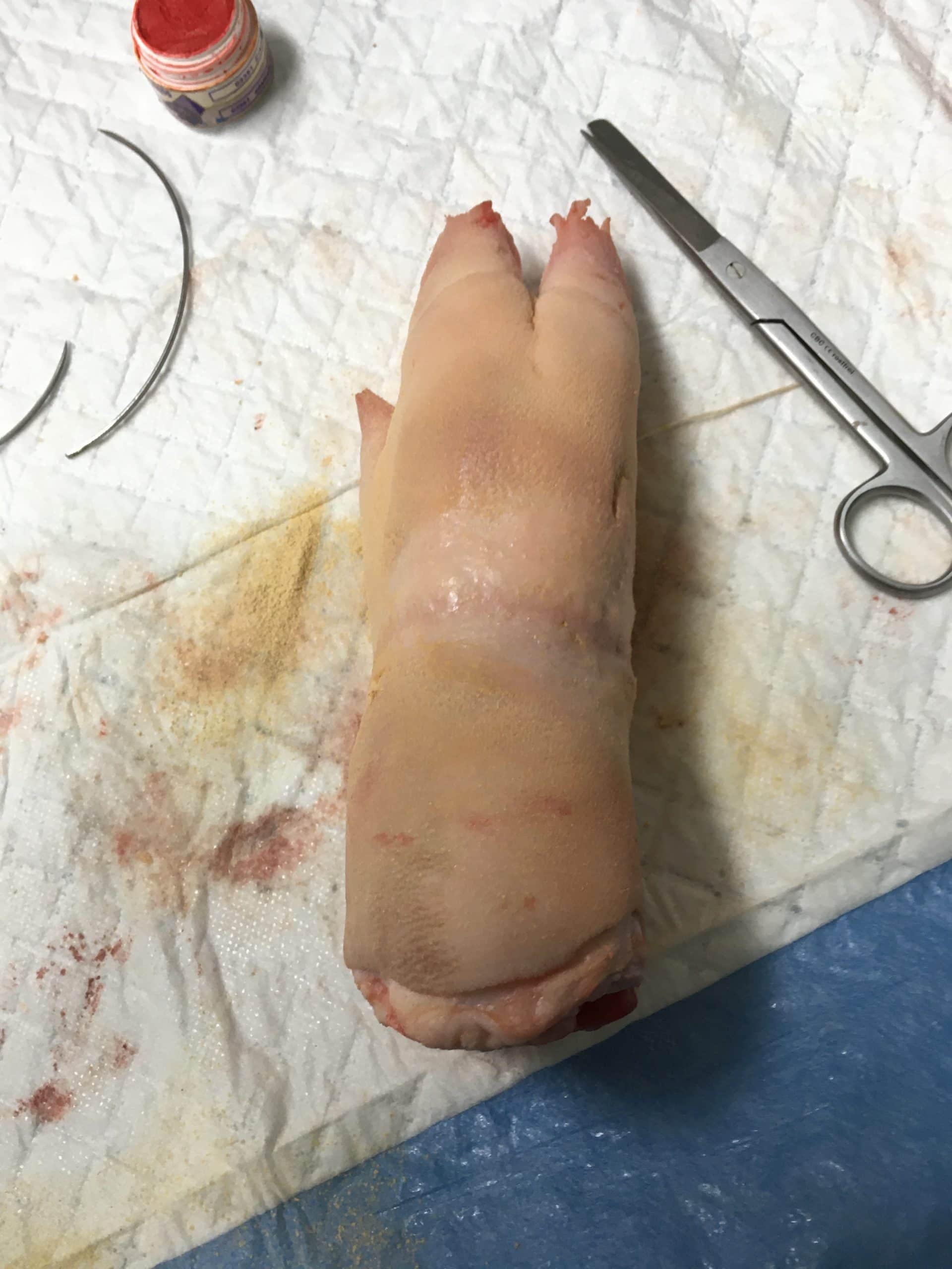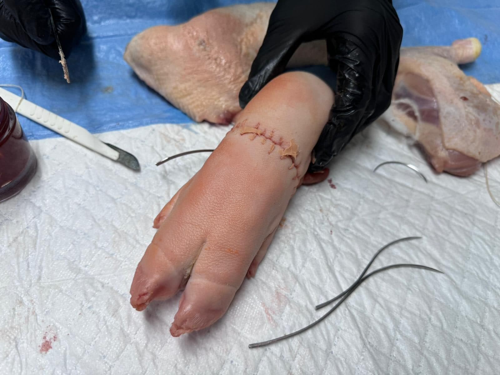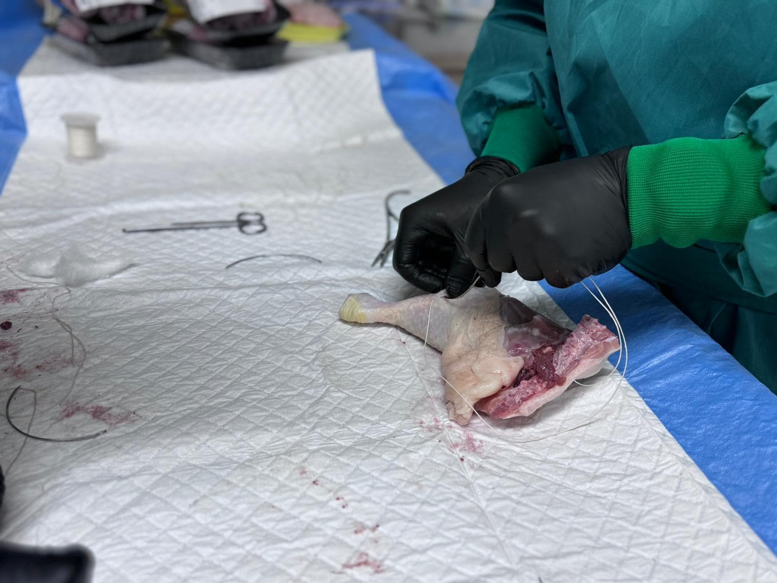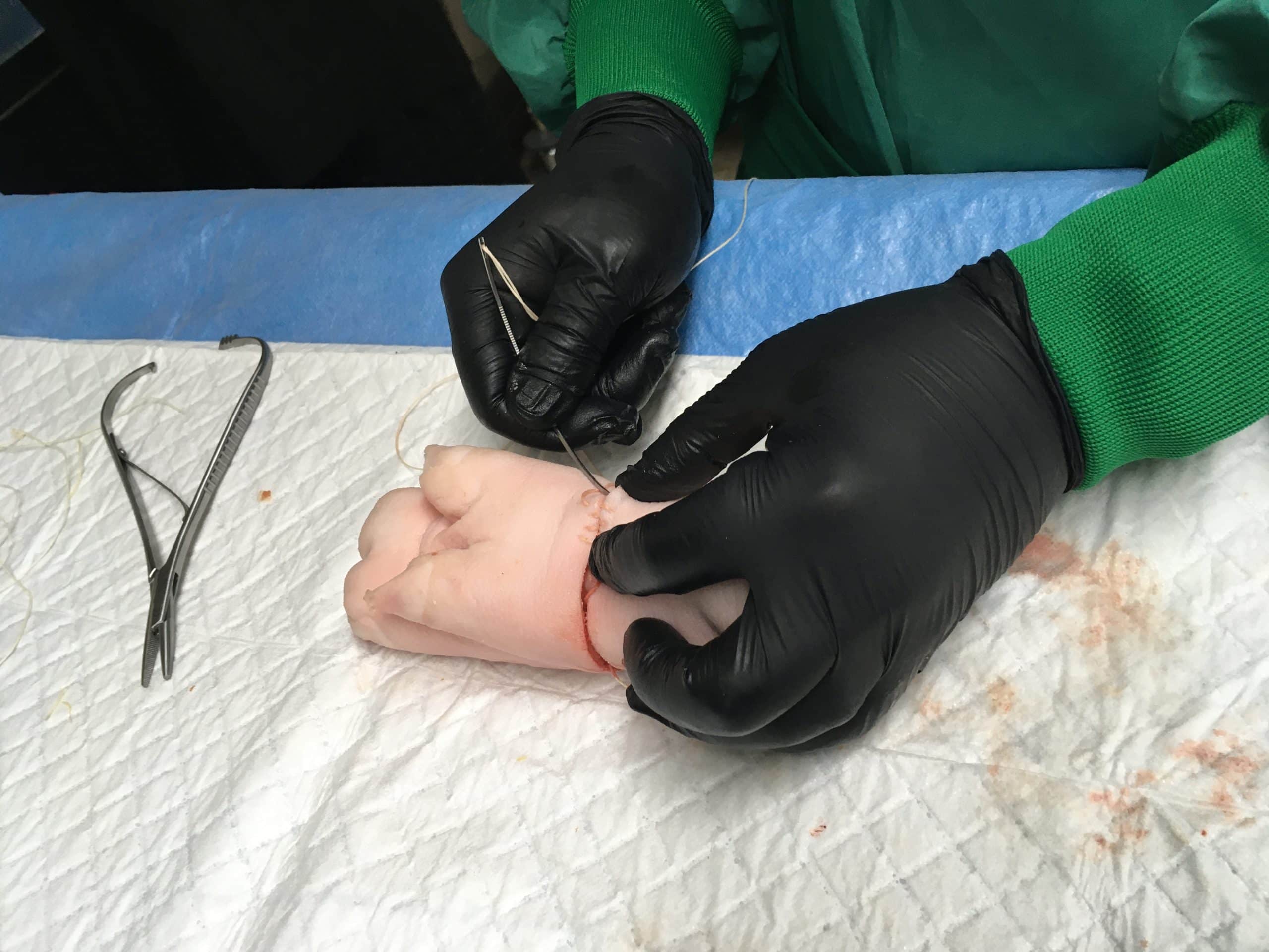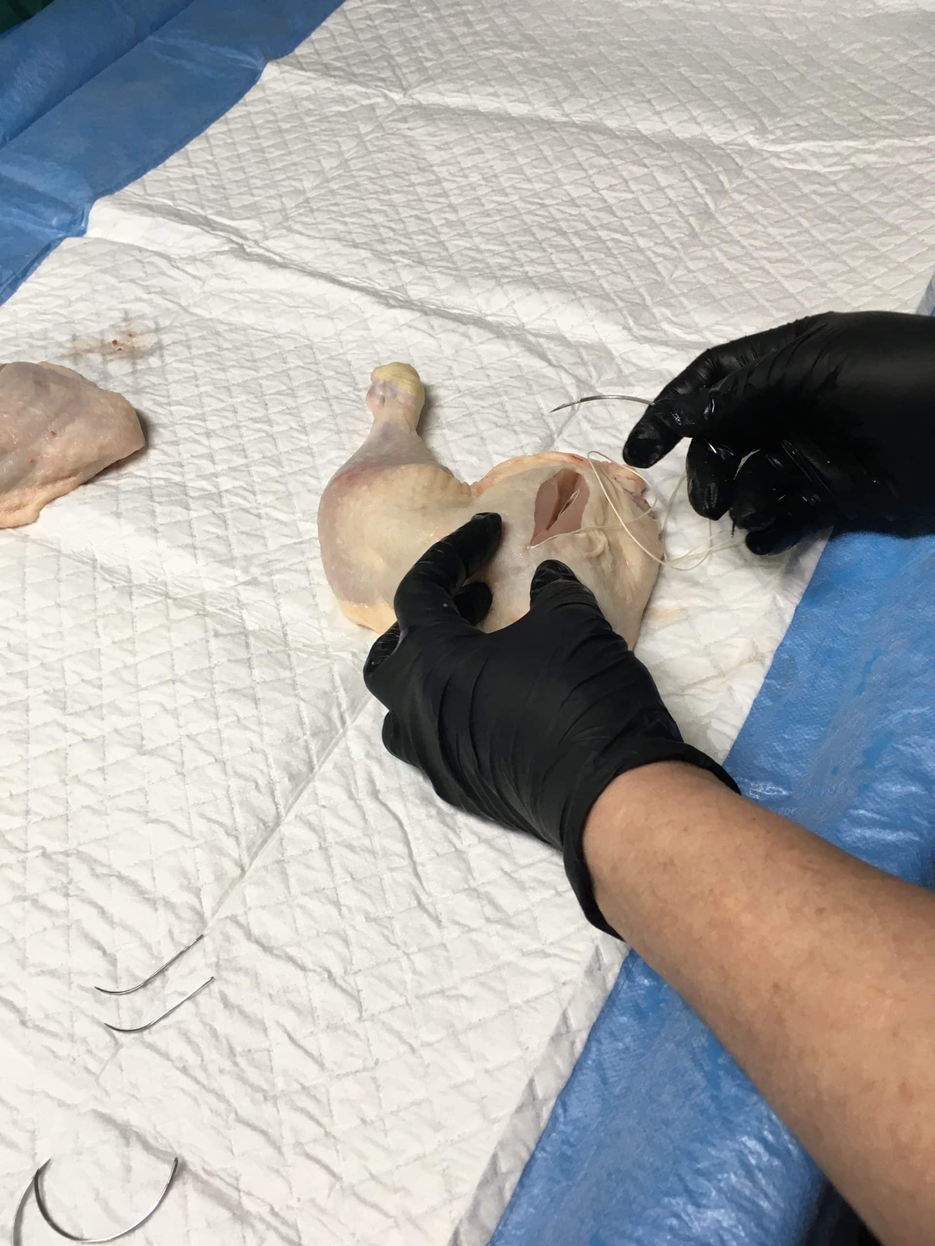 Nahttechniken werden an Hühnerschenkeln und Schweinefüßen geübt.
