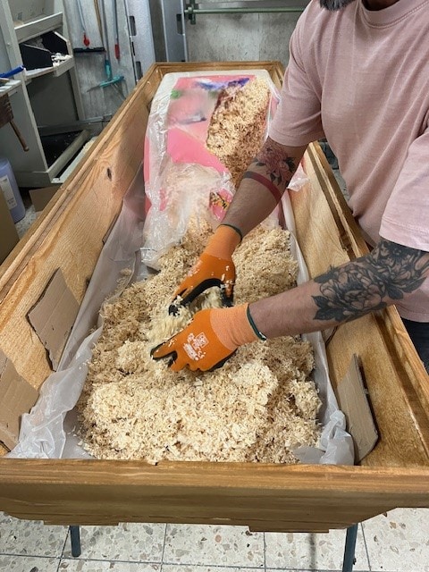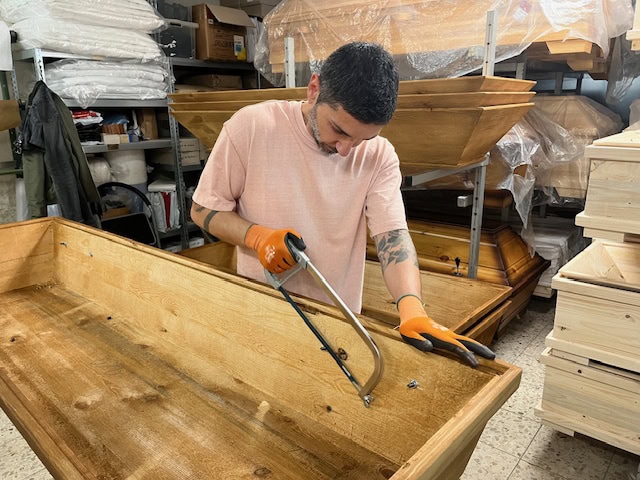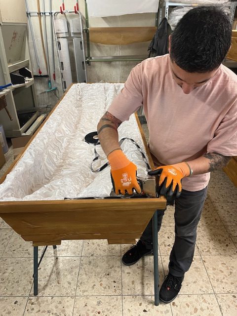 Der Sargrohling wird komplett von innen abgedichtet, befüllt und mit Stoff ausgekleidet. Die Sargfüße werden am Unterteil des Sarges montiert und die seitlichen Griffe fachgerecht angeschraubt.