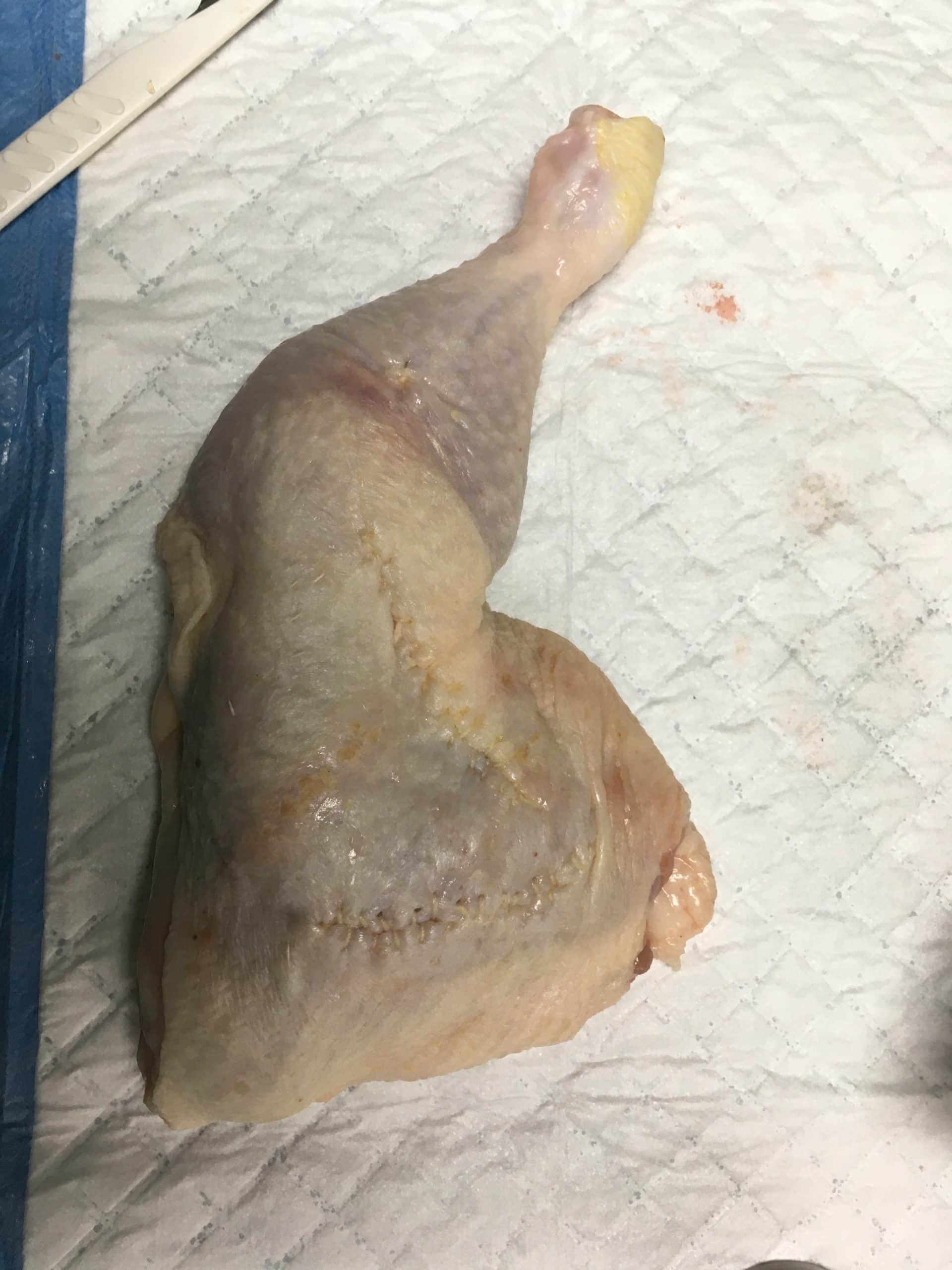 Ähnlich sieht man den Vorgang hier bei einem Hühnerschenkel. Erst wird die Wunde fachmännisch verschlossen und dann so abgedeckt, dass man sie möglichst nicht mehr erkennen kann.