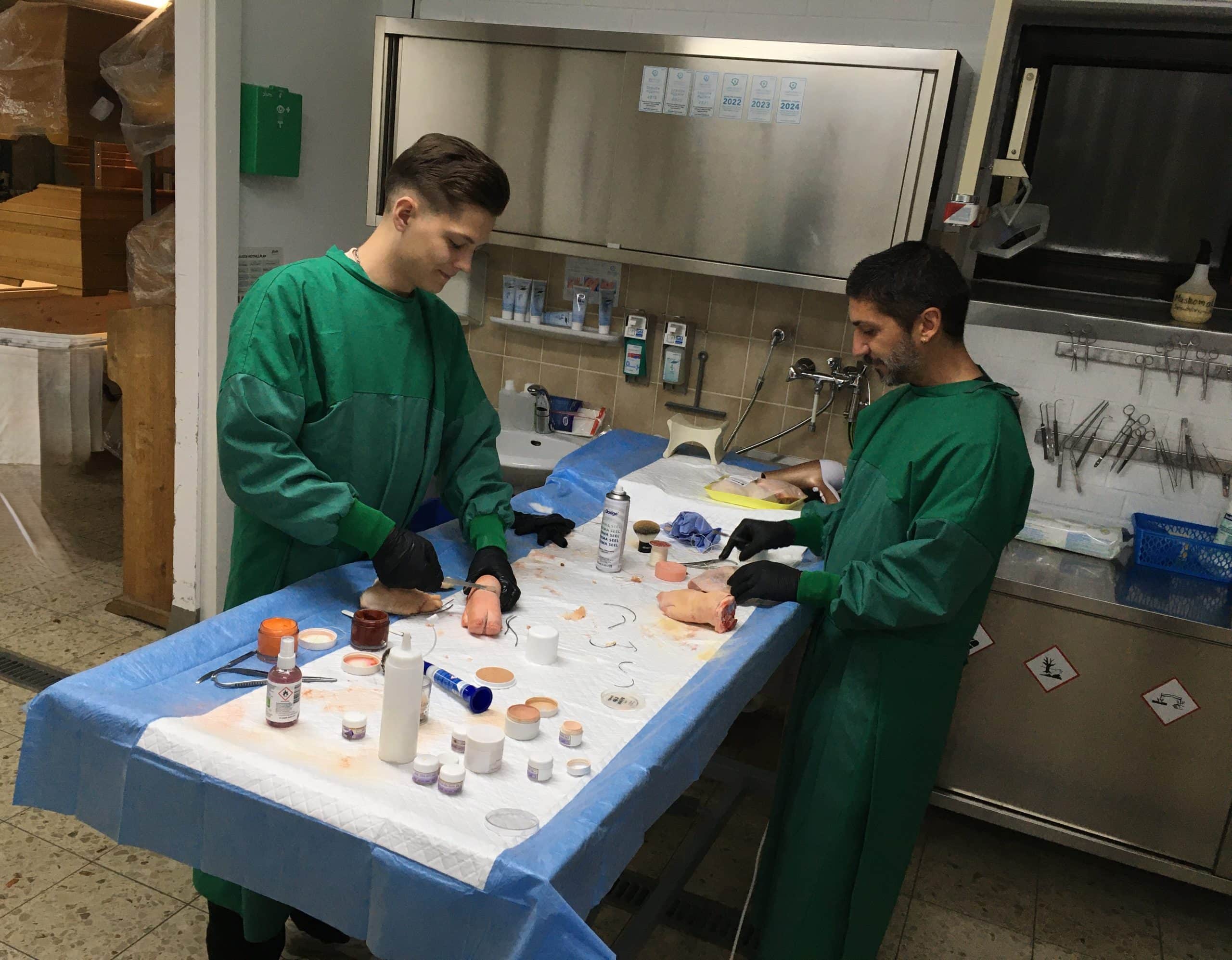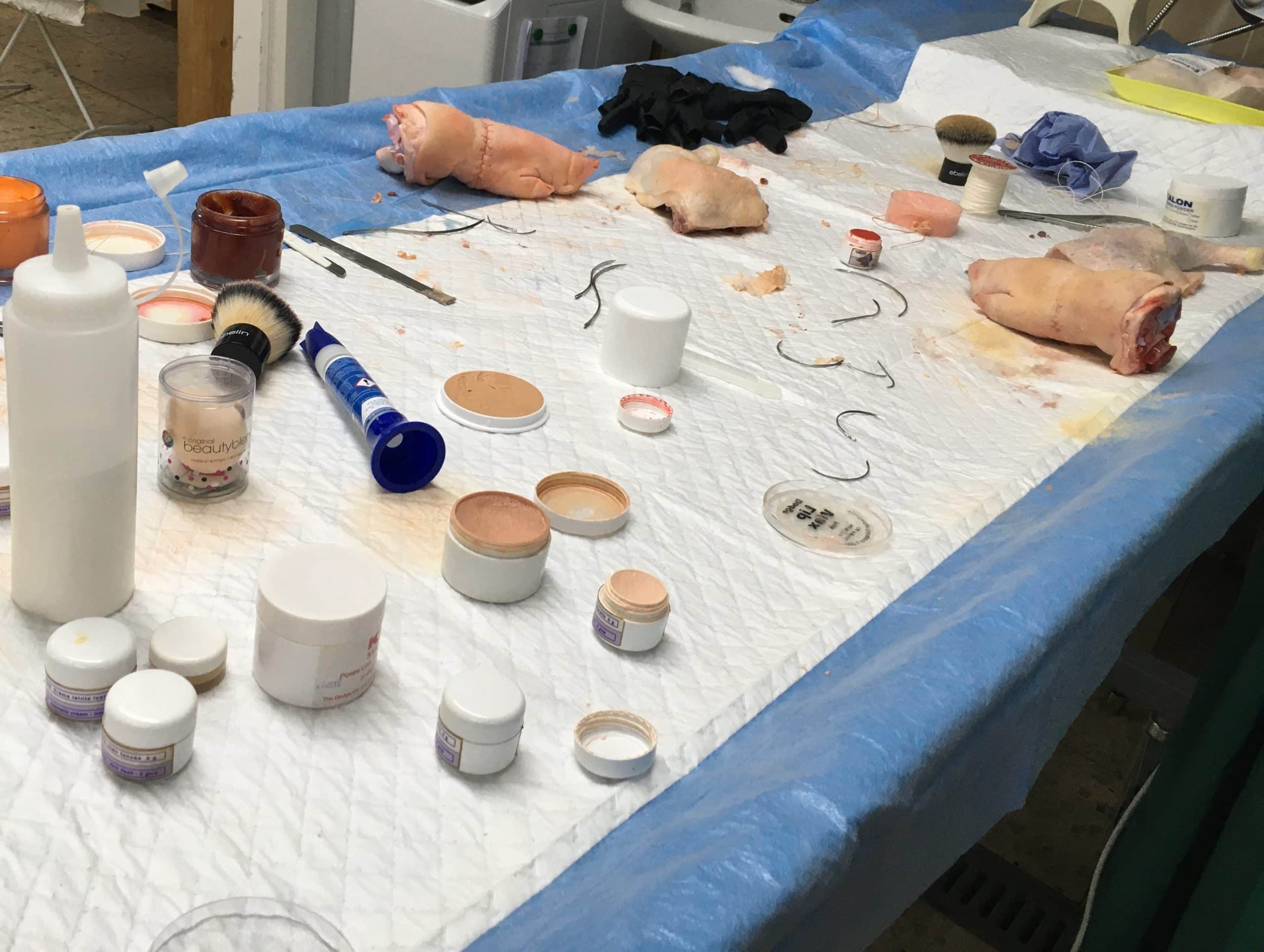 Auf den Bildern: die Wunde an dem Schweinefuß wird zuerst mit der richtigen Technik genäht und anschließend überschminkt.