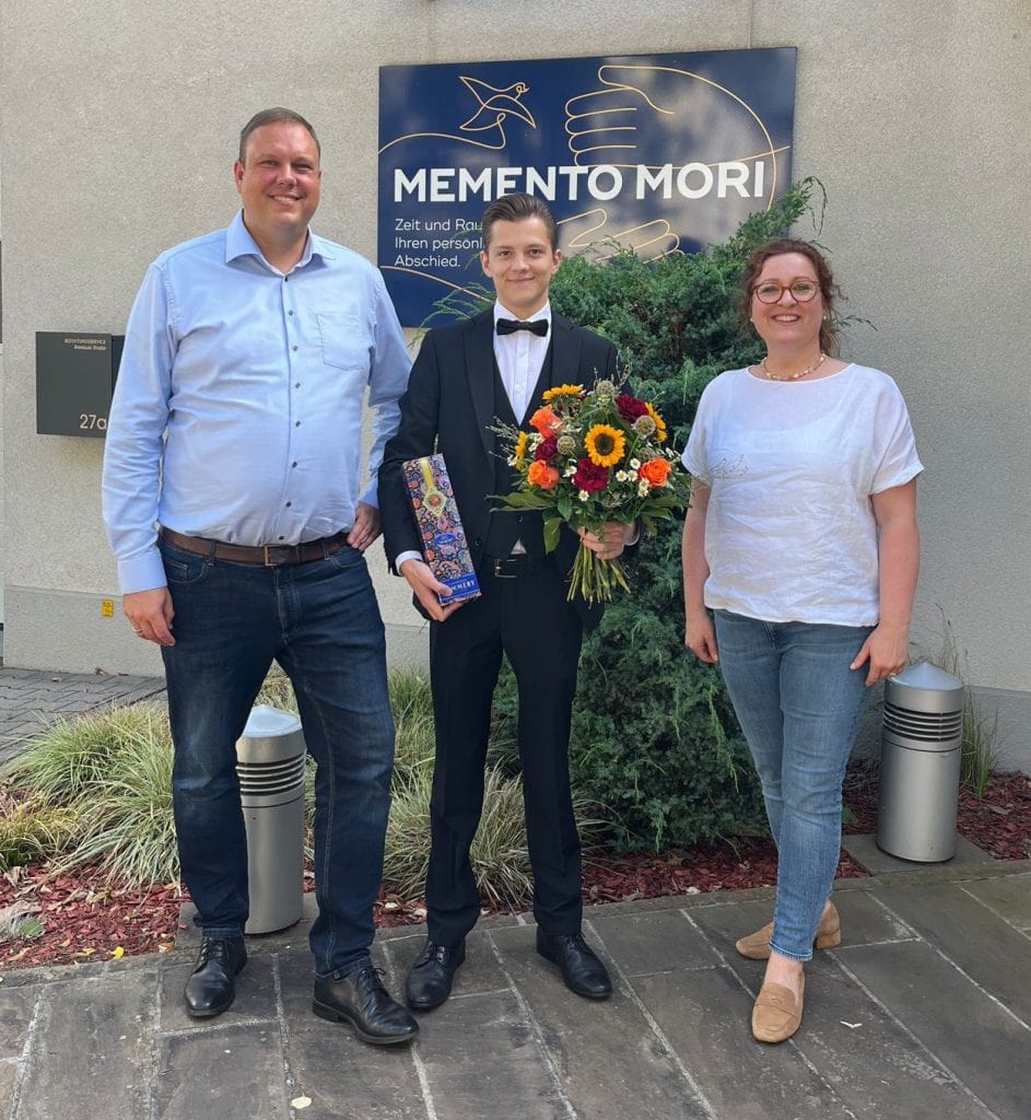 Deswegen machte er schon früh während seiner Schullaufbahn ein Praktikum bei einem Bestatter, das der Vater ihm organisiert hatte. Das weckte bei ihm so großes Interesse, dass er sich bei uns bewarb. Und nach einer Woche Praktikum bei uns stand seine Entscheidung dann endgültig fest: er wollte und will Bestatter werden!