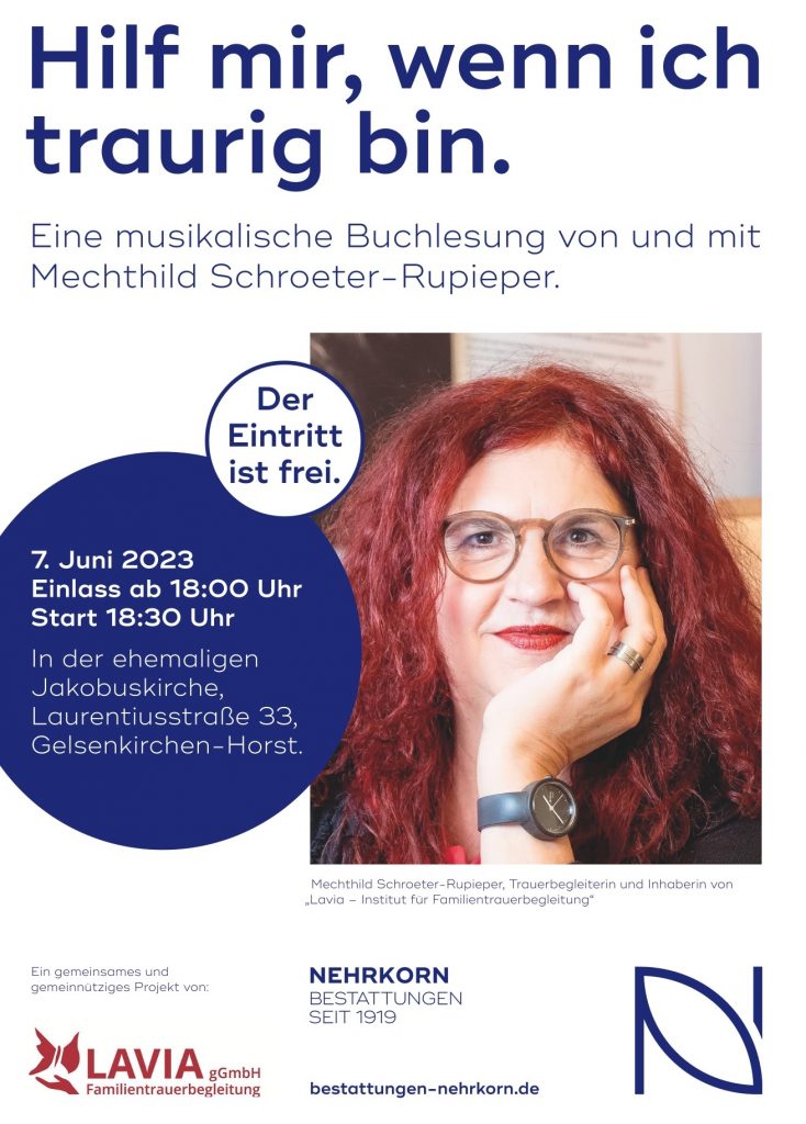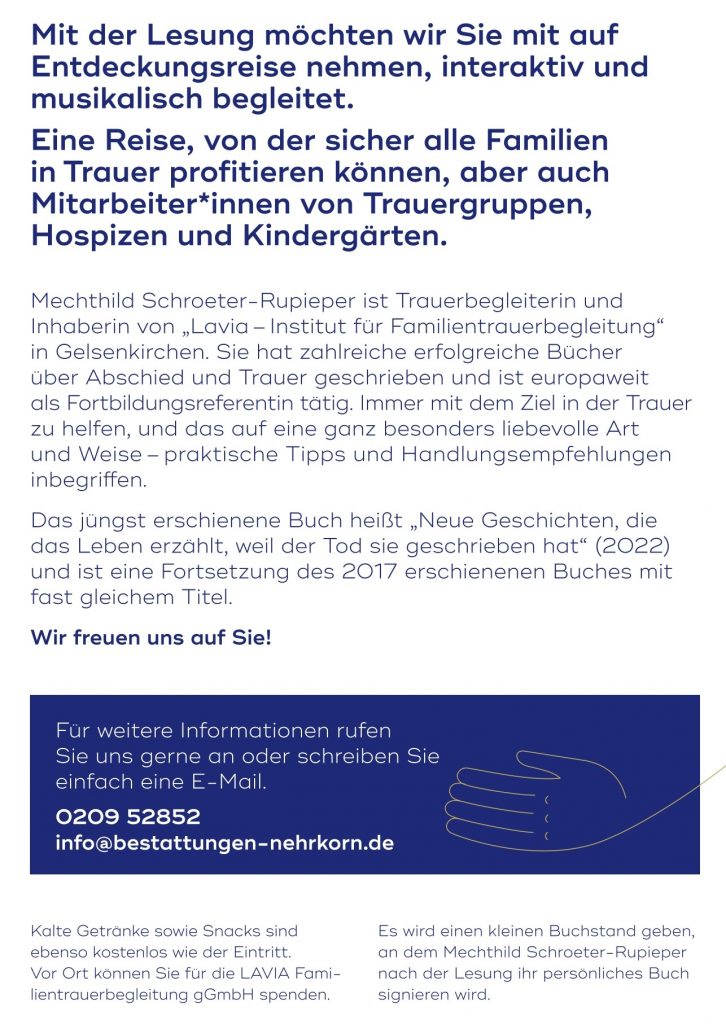 Der Eintritt ist frei. Wir freuen uns jedoch über Spenden für die gemeinnützige GmbH von Lavia. Ihre Spenden ermöglichen, dass junge Familien, in denen Kinder, Geschwister, junge Eltern oder Partner*innen versterben oder verstorben sind, schnell und kompetent Hilfe in Form von Akuthilfe und Trauergruppenarbeit erhalten.