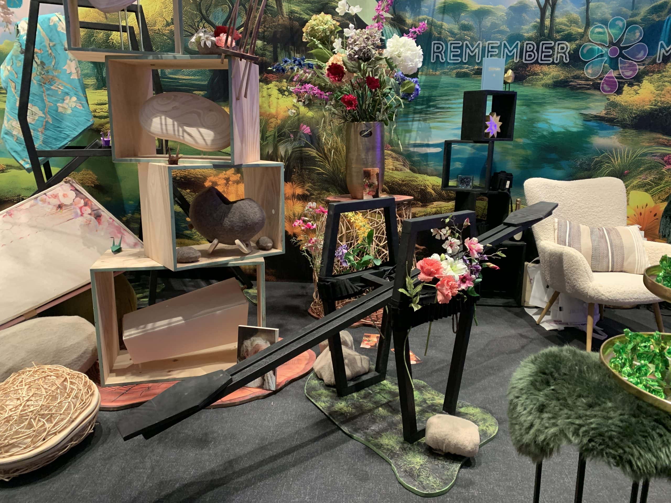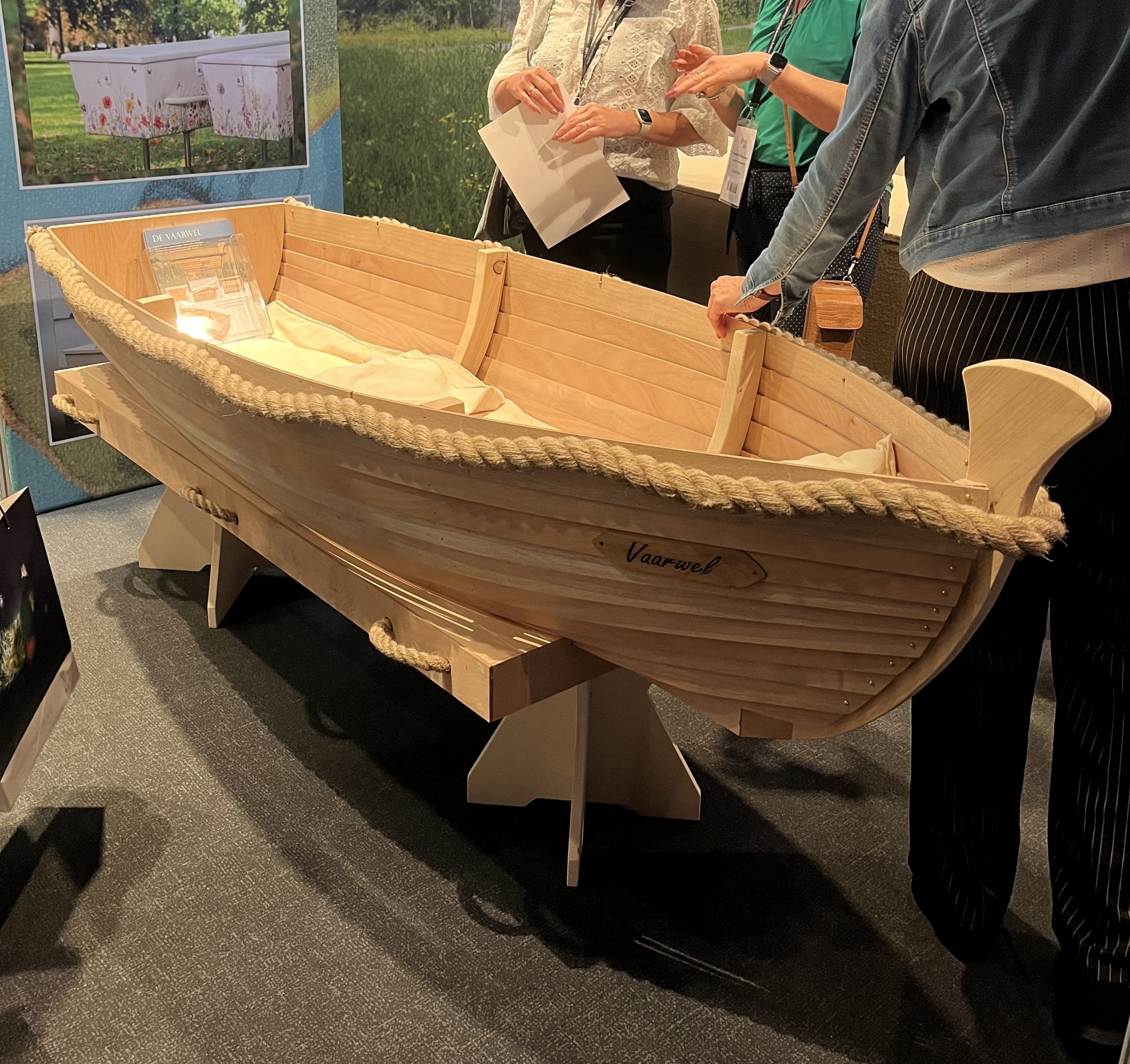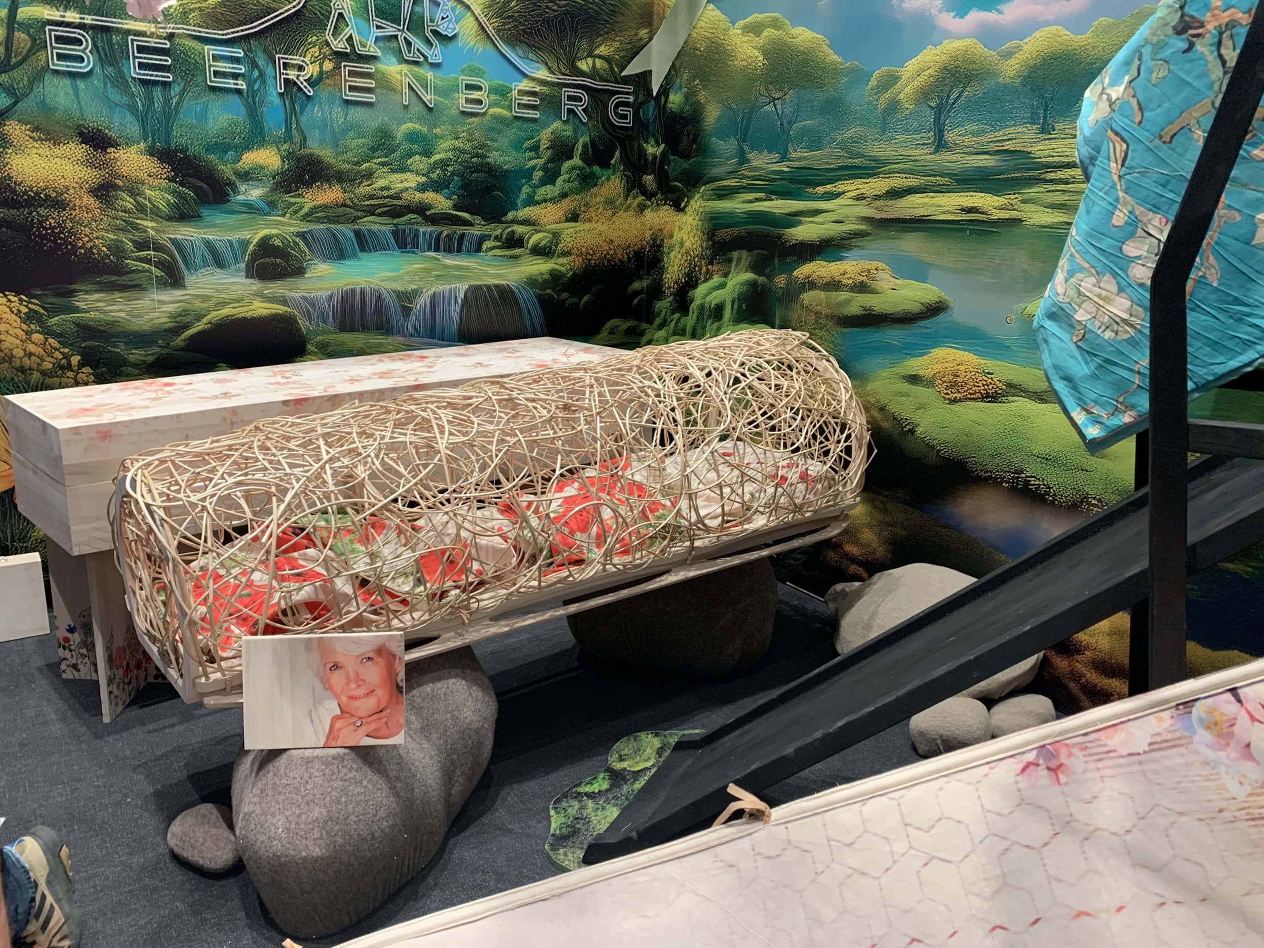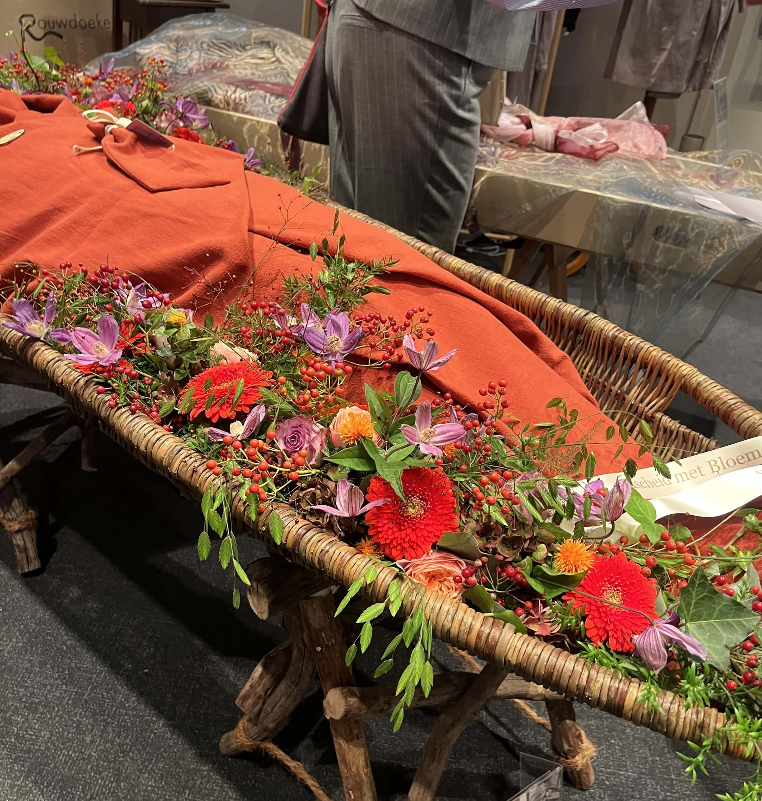 Sicher, die Holländer haben eine eigene Bestattungskultur und auch ganz andere Bestattungsgesetze als wir hier in Deutschland. Zum Beispiel gibt es keine Sargpflicht, wie hier. Deswegen finden sich auf der Messe auch viele schöne aus Korb geflochtene Särge und Urnen. Diese Art ermöglicht den Blick auf das Innere. Bei Erdbestattungen werden die Verstorbenen in spezielle Leichentücher gewickelt, und auch die sind bunt. Kombiniert mit Blumendekorationen ergibt das ein ganz anderes Bild, als das was wir kennen (geschlossener Sarg aus Holz mit einem Blumengesteck darauf).