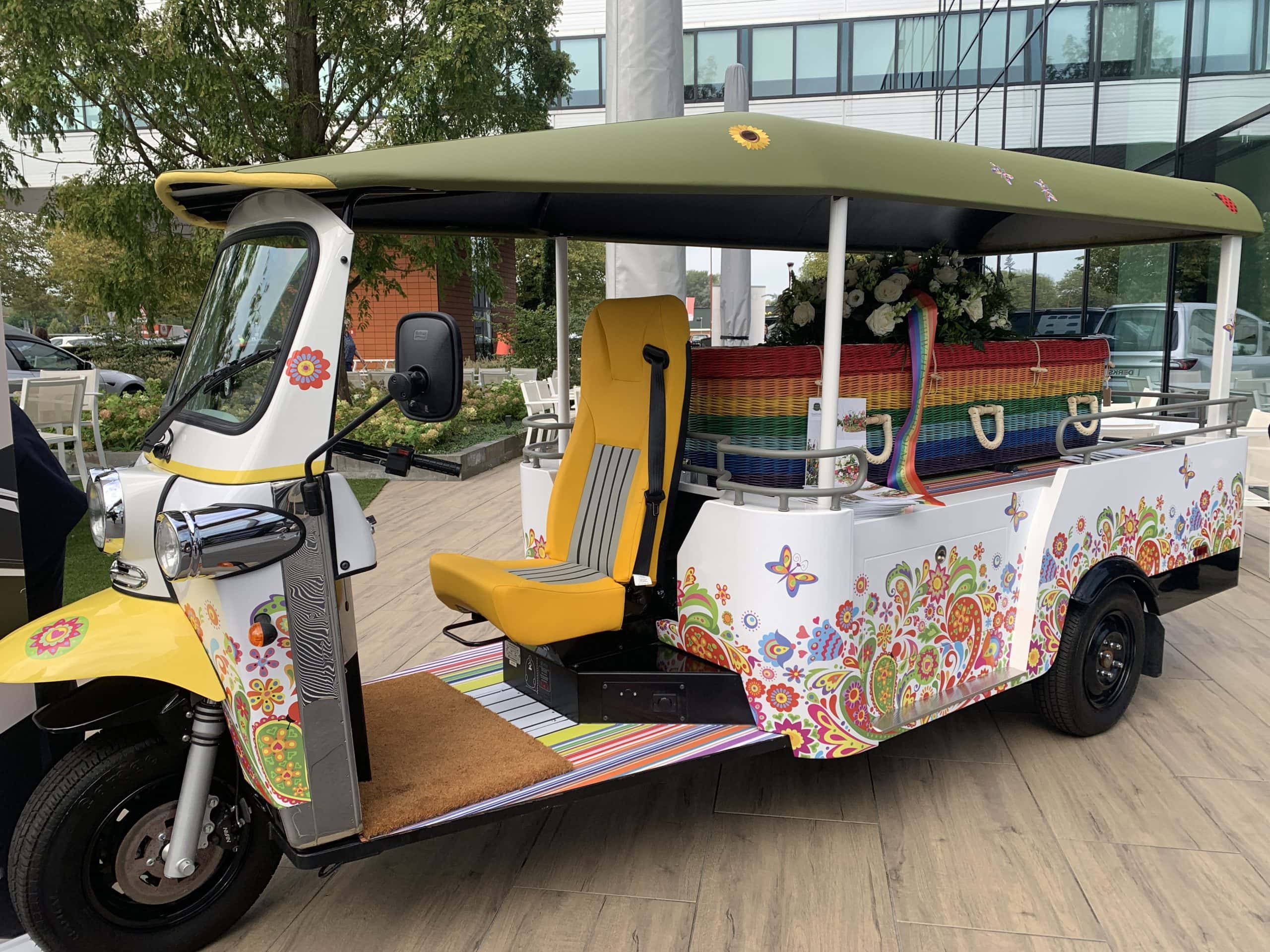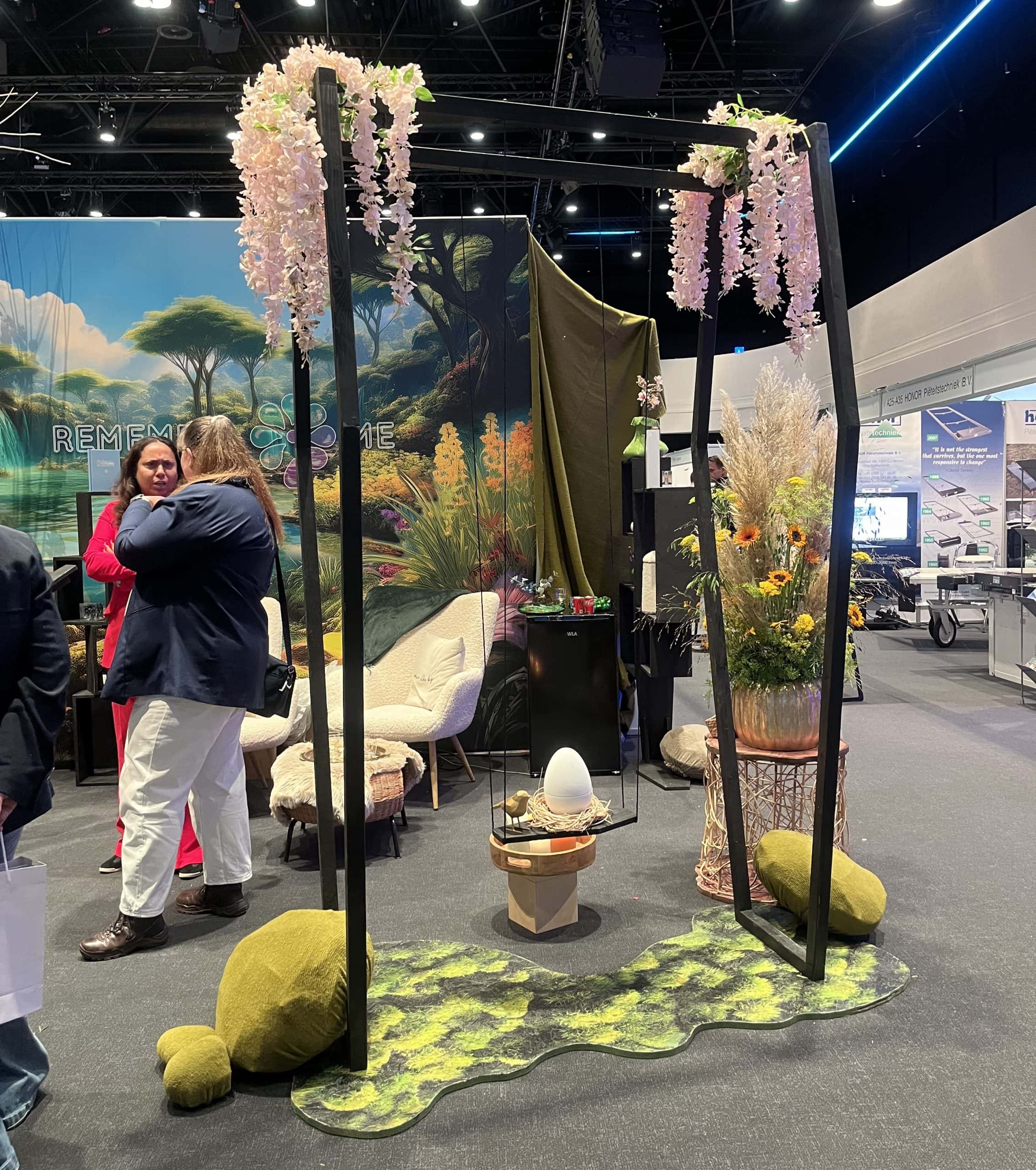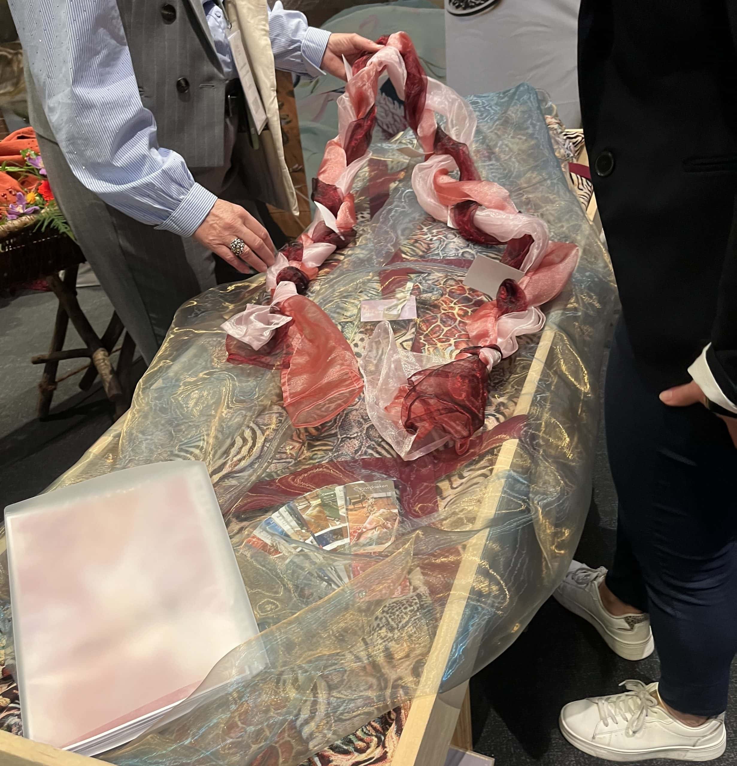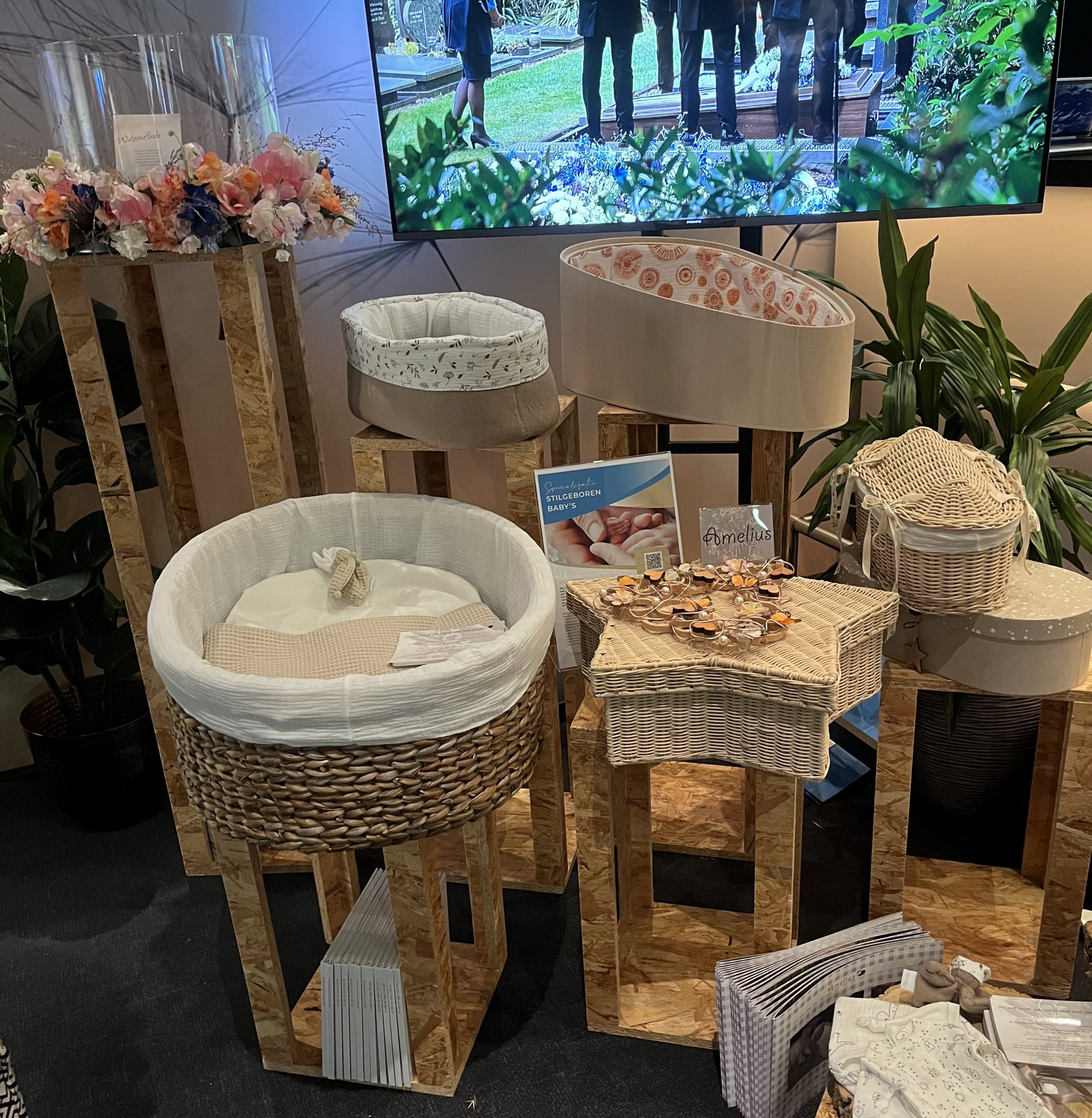 Sicher, die Holländer haben eine eigene Bestattungskultur und auch ganz andere Bestattungsgesetze als wir hier in Deutschland. Zum Beispiel gibt es keine Sargpflicht, wie hier. Deswegen finden sich auf der Messe auch viele schöne aus Korb geflochtene Särge und Urnen. Diese Art ermöglicht den Blick auf das Innere. Bei Erdbestattungen werden die Verstorbenen in spezielle Leichentücher gewickelt, und auch die sind bunt. Kombiniert mit Blumendekorationen ergibt das ein ganz anderes Bild, als das was wir kennen (geschlossener Sarg aus Holz mit einem Blumengesteck darauf).