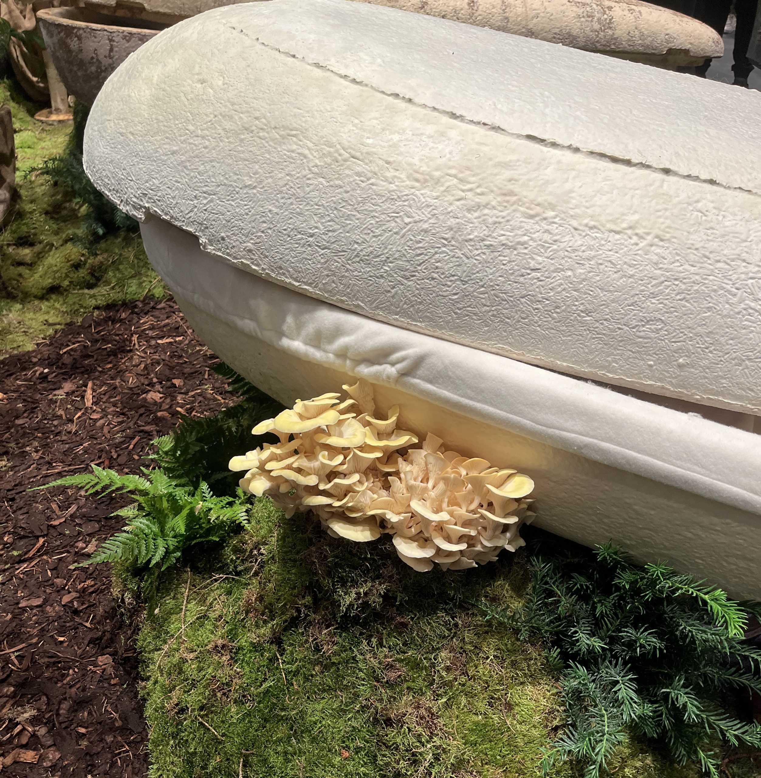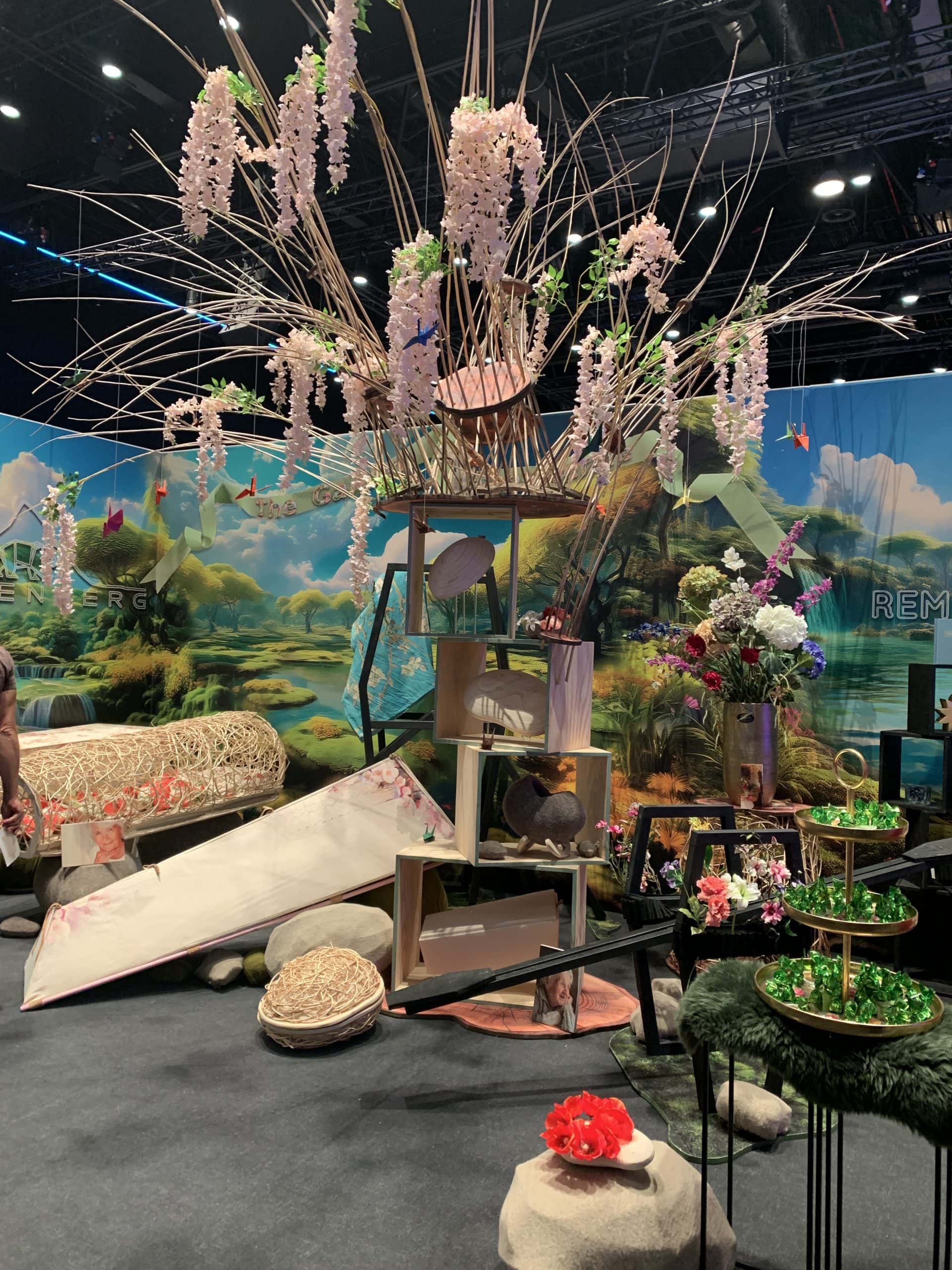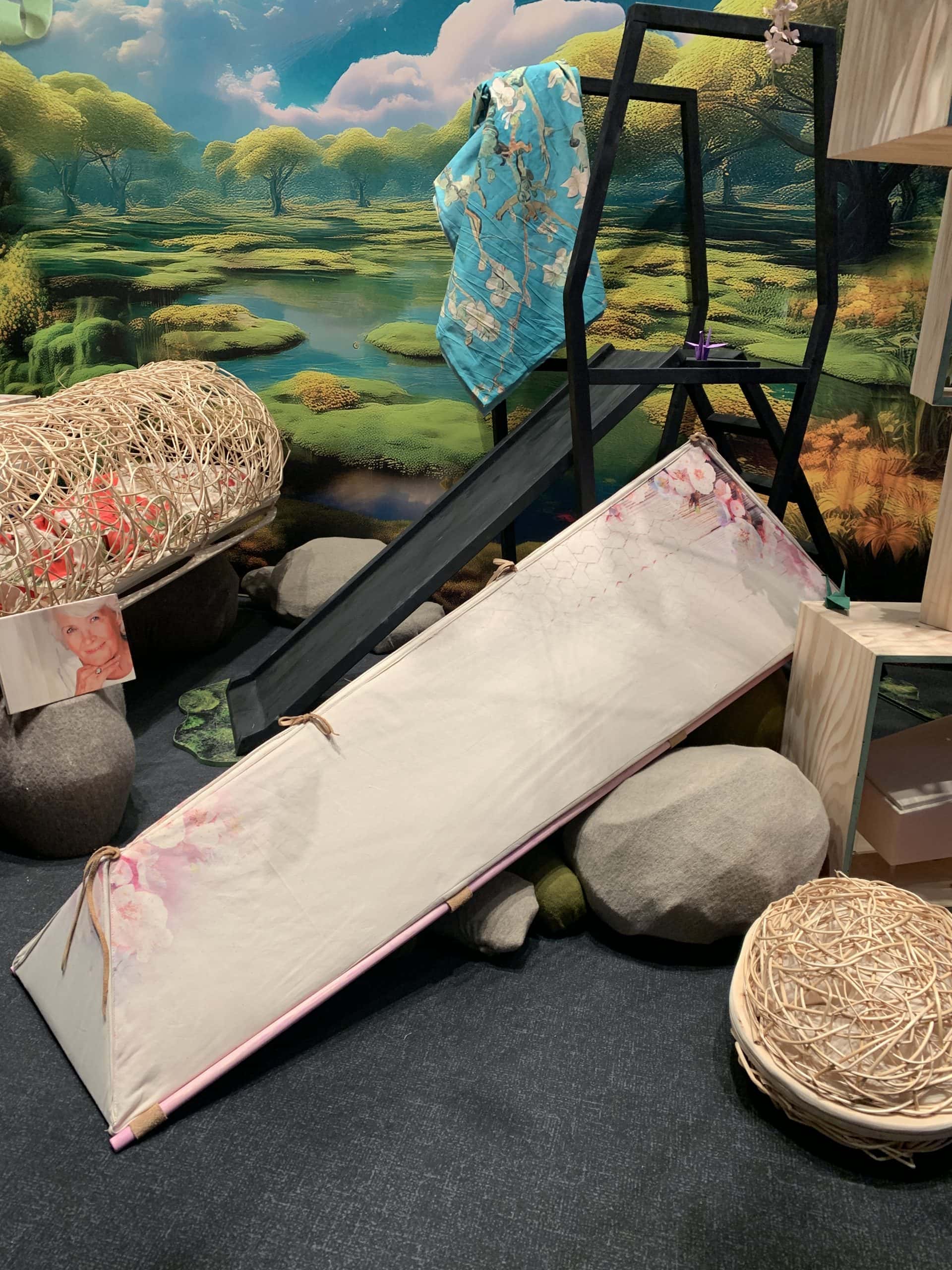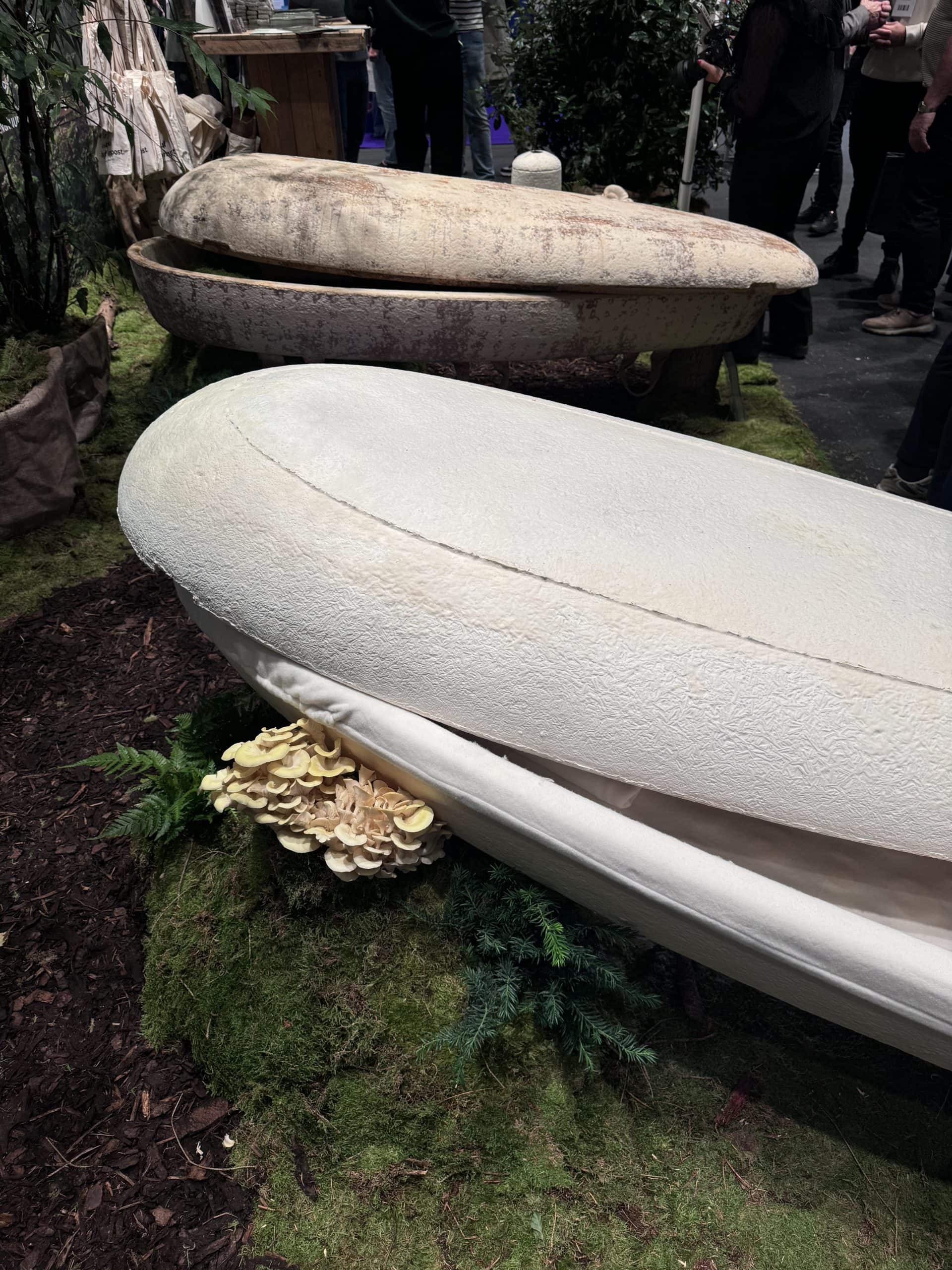 Sicher, die Holländer haben eine eigene Bestattungskultur und auch ganz andere Bestattungsgesetze als wir hier in Deutschland. Zum Beispiel gibt es keine Sargpflicht, wie hier. Deswegen finden sich auf der Messe auch viele schöne aus Korb geflochtene Särge und Urnen. Diese Art ermöglicht den Blick auf das Innere. Bei Erdbestattungen werden die Verstorbenen in spezielle Leichentücher gewickelt, und auch die sind bunt. Kombiniert mit Blumendekorationen ergibt das ein ganz anderes Bild, als das was wir kennen (geschlossener Sarg aus Holz mit einem Blumengesteck darauf).