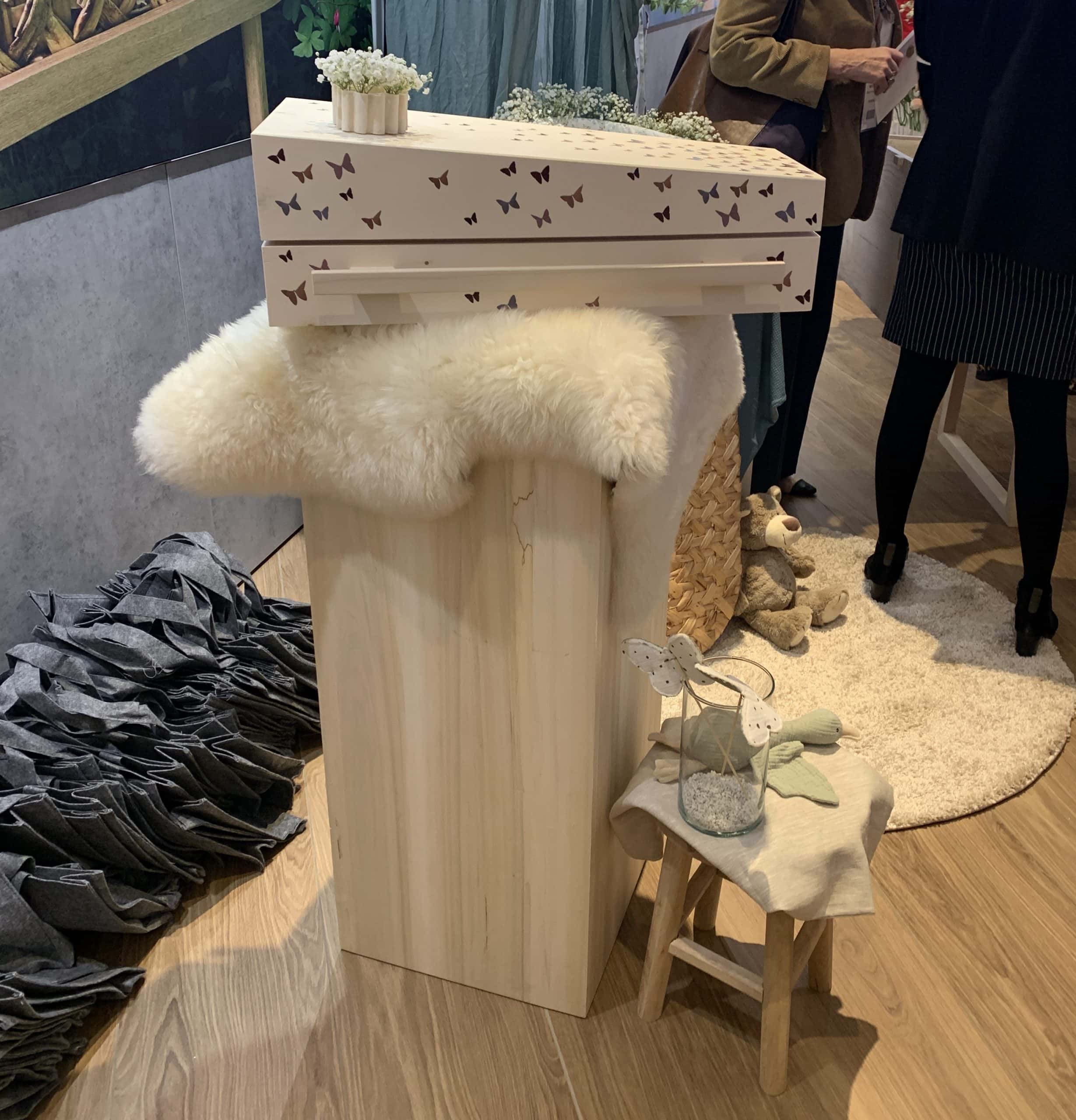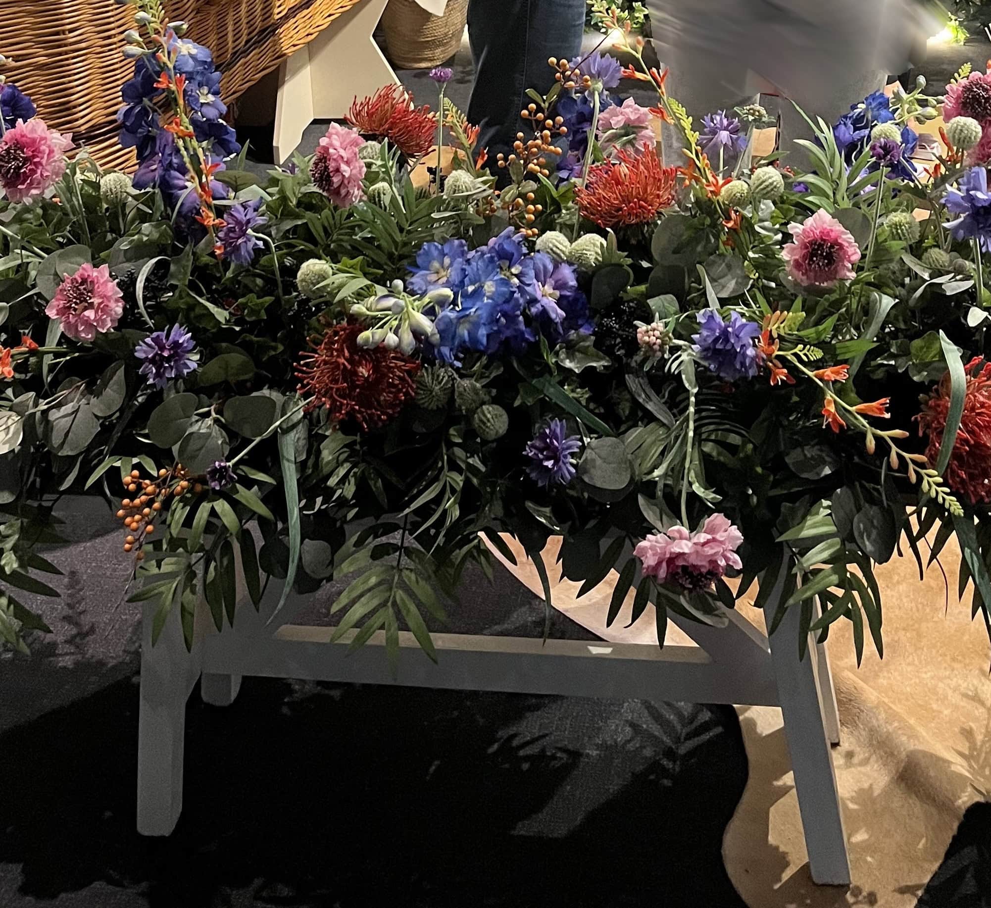 Apropos Blumendekorationen, als wir vor 2 Jahren auf der Messe waren haben wir das Blumenband entdeckt. Dabei handelt es sich um ein Stoffband mit Schlaufen. Das Band wird rund um den Sarg oder die Urne befestigt. Entweder vor oder während der Trauerfeier werden in diese Schlaufen Blumen gesteckt. Während der Trauerfeier kann das gemeinsame Schmücken des Sarges mit Blumen ein gutes Abschiedsritual sein. So oder so wird der Sarg am Ende individuell und schön geschmückt sein. Kein Wunder also, dass sich das Blumenband auch hier immer größer werdender Nachfrage erfreut.